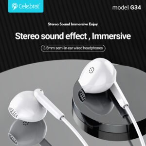 CELEBRAT earphones με μικρόφωνο G34, 3.5mm σύνδεση, 14mm, 1.2m, λευκά
