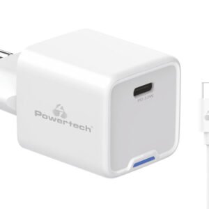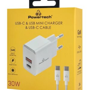 POWERTECH φορτιστής τοίχου PT-1249, καλώδιο, USB/USB-C, 30W, GaN, λευκός