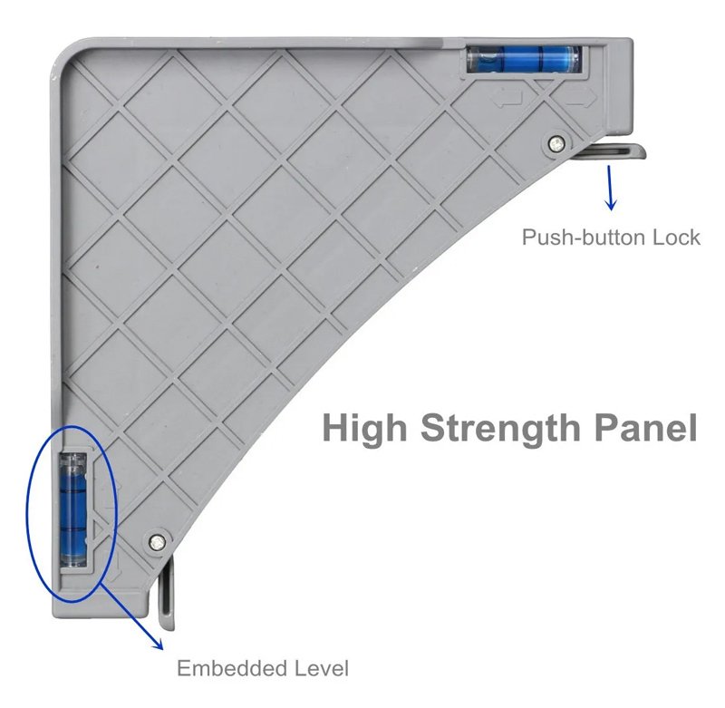 Διαθέτει 4 τροχούς με φρένα ακινητοποίησης, 4 ποδαράκια ρυθμιζόμενου ύψους και αλφάδι για την διευκόλυνση της τοποθέτησης των αντικειμένων.