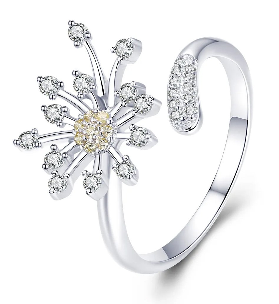 Εντυπωσιακό δαχτυλίδι, σε σχήμα dandelion, διακοσμημένο με αστραφτερή κυβική ζιρκόνια, λευκού χρώματος και χρυσού χρώματος, η οποία αντανακλά μοναδικά το φως και προσφέρει λάμψη στο κόσμημα.
