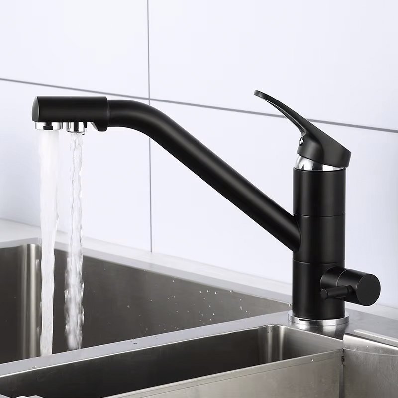 Αυτή η εκπληκτική μπαταρία πάγκου κουζίνας διαθέτει τρίοδο σχεδιασμό για τη σύνδεση με φίλτρο νερού και το δίκτυο παροχής ζεστού και κρύου νερού. Έτσι, μπορείτε να απολαμβάνετε καθαρό, φιλτραρισμένο νερό και να επιλέξετε παράλληλα ανάμεσα σε ζεστό και κρύο νερό με τους διακόπτες.