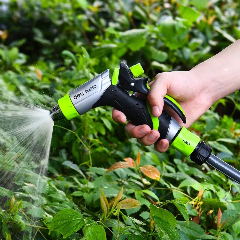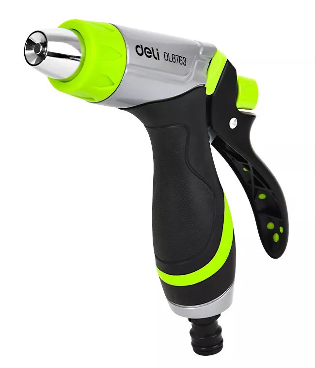 Πιστόλι εκτόξευσης νερού της Deli με 3 λειτουργίες ψεκασμού. Διαθέτει αντιολισθητική λαβή που εφαρμόζει καλά στο χέρι για πιο ξεκούραστο πότισμα.