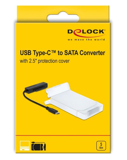 Αυτός ο αντάπτορας USB-C σε SATA της Delock μπορεί να χρησιμοποιηθεί για την σύνδεση ενός 2.5″ SATA HDD ή SSD με έναν επιτραπέζιο ή φορητό υπολογιστή. Μαζί με τον αντάπτορα συμπεριλαμβάνεται και θήκη προστασίας για την εισαγωγή ενός SSD ή HDD με ύψος έως 9.5mm.