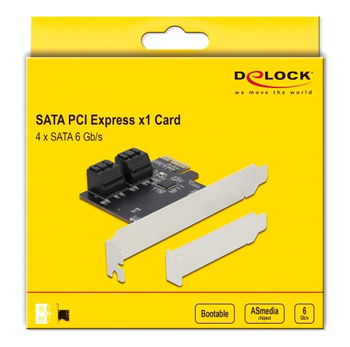 Η κάρτα επέκτασης PCI από τη Delock επεκτείνει το desktop με 4 εσωτερικές θύρες SATA. Διαφορετικές συσκευές όπως δίσκοι SSD, σκληροί δίσκοι, δίσκοι DVD κ.λπ. μπορούν να συνδεθούν στην κάρτα.