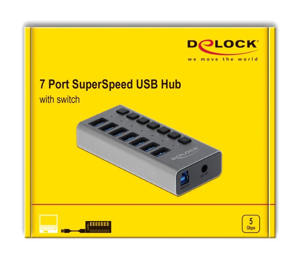 Το Hub USB 3.0 της Delock μπορεί να συνδεθεί με υπολογιστή μέσω καλωδίου USB επεκτείνοντας τον με 7 θύρες USB. Οι συνδεδεμένες συσκευές όπως τα smartphone μπορούν να φορτιστούν ή να μεταφέρουν δεδομένα στα 5 Gbps. Κάθε θύρα μπορεί να ενεργοποιηθεί ή να απενεργοποιηθεί ξεχωριστά χρησιμοποιώντας τους διακόπτες. Είναι ένα κομψό προϊόν υψηλής ποιότητας το οποίο είναι κατασκευασμένο από αλουμίνιο. Το design και η αίσθηση του μεταλλικού υλικού της κατασκευής δίνει ιδιαίτερο τόνο στο γραφείο σας, ταιριάζοντας αρμονικά με τις υπόλοιπες συσκευές σας.