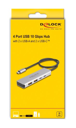 Αυτό το hub της Delock μπορεί να συνδεθεί με το laptop ή το desktop σας μέσω θύρας USB-C και να επεκτείνει τις θύρες του με 2x USB και 2x USB-C θύρες. Διαφορετικές συσκευές USB, όπως docking stations, card readers, εξωτερικοί HDD/SSD κλπ. μπορούν να συνδεθούν μέσω του hub.