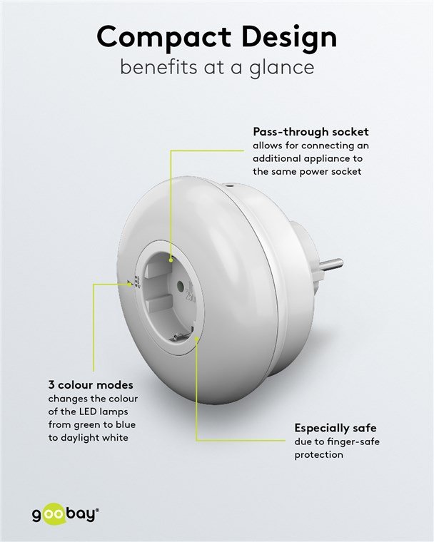 Φωτιστικό νυκτός LED της Goobay με 3 επιλογές χρώματος φωτισμού και passthrough πρίζα schuko για την αξιοποίηση της πρίζας του σπιτιού. Εξοπλίζεται με αισθητήρα φωτός για την αυτόματη ενεργοποίηση του φωτιστικού όταν η φωτεινότητα φτάσει σε επίπεδο κάτω από 21 lx.