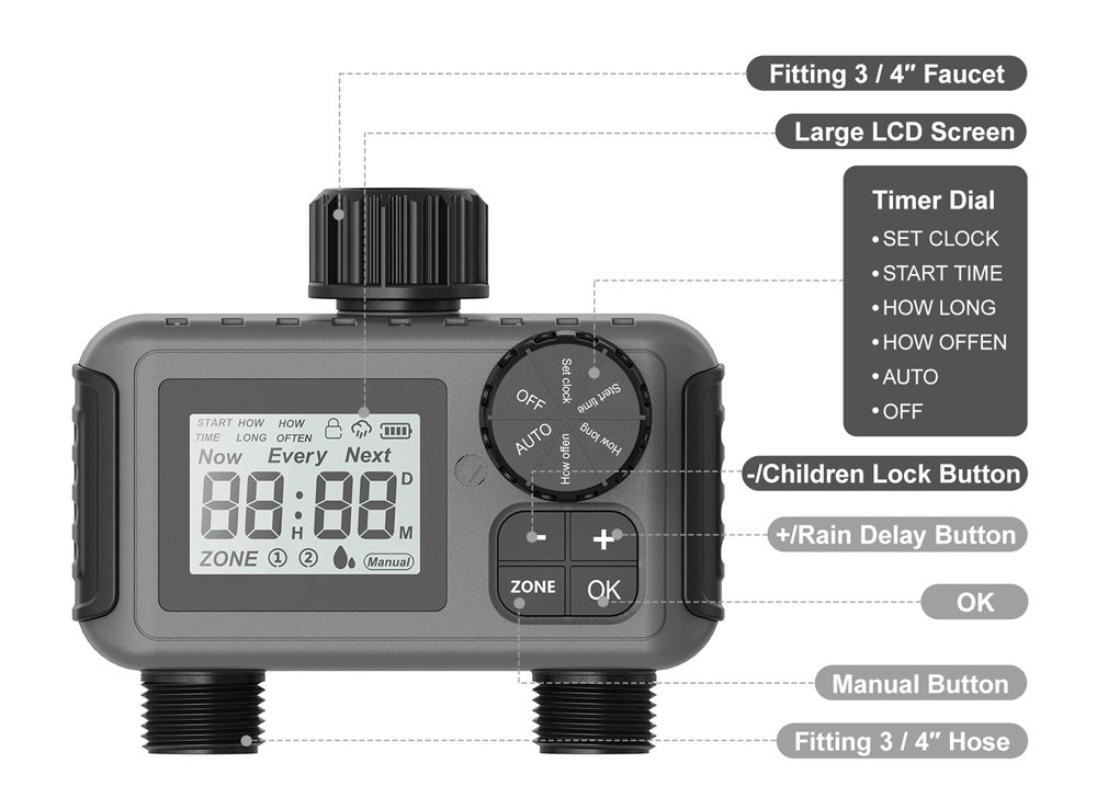 Σας επιτρέπει με εύκολο τρόπο να ορίζετε τον χρόνο του ποτίσματος και την διάρκεια του σε ήμερες. Επιπλέον, διαθέτει λειτουργία αναβολής του ποτίσματος λόγο βροχής.