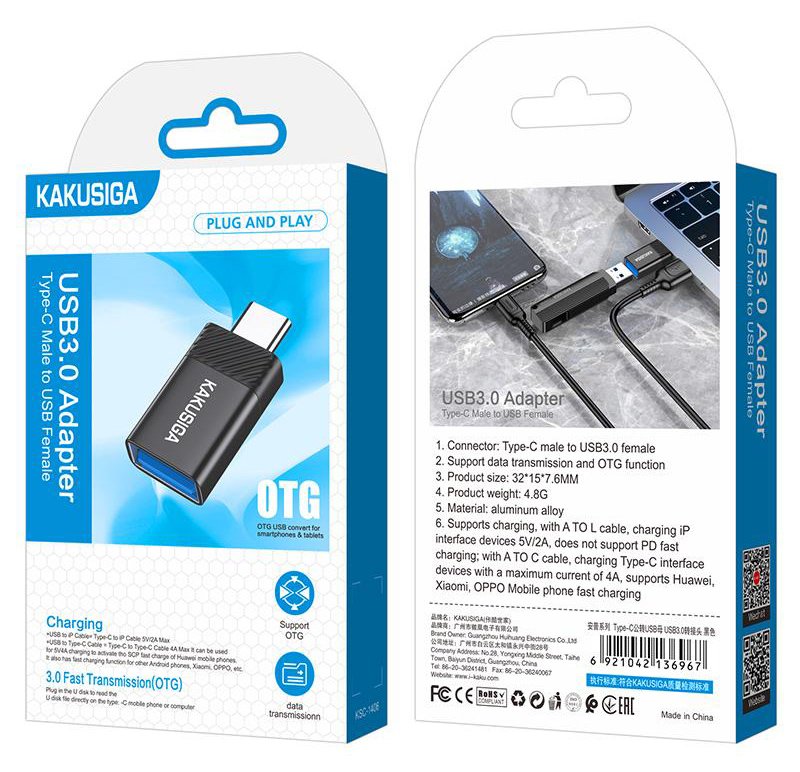 Αντάπτορας USB-C σε USB της KAKUSIGA, ιδανικός για τη σύνδεση ποντικιών, πληκτρολογίων, USB flash drives ή εξωτερικών σκληρών δίσκων σε smartphone και tablet.