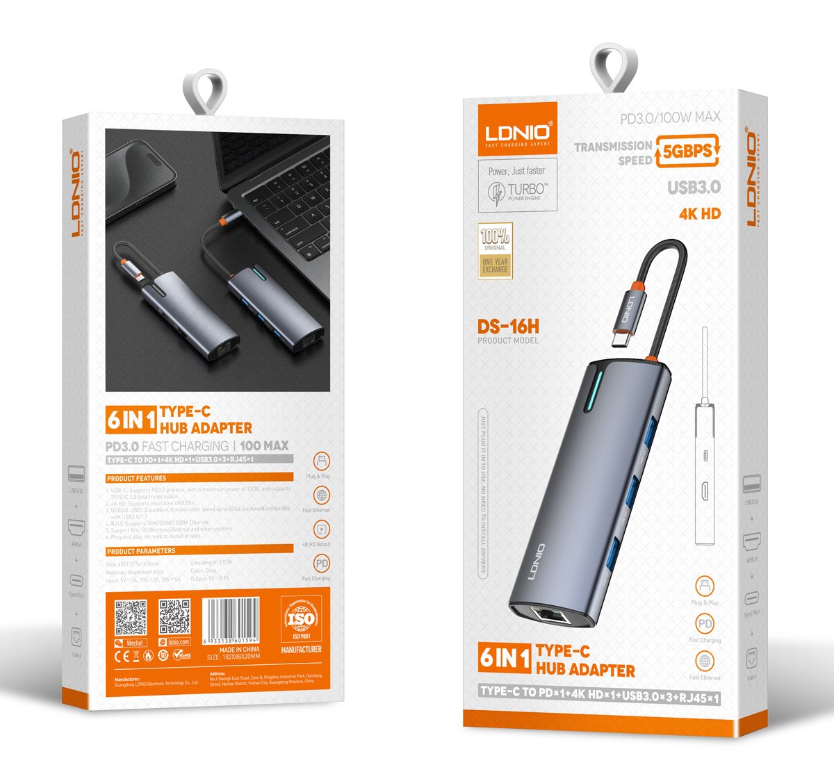 LDNIO docking station DS-16H, 6 θυρών, USB-C σύνδεση, 4K, 100W PD, γκρι