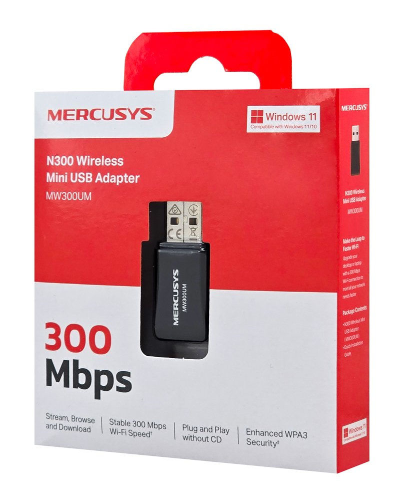 Ο ασύρματος USB αντάπτορας δικτύου MW300UM της MERCUSYS σας επιτρέπει να συνδέσετε ένα σταθερό ή φορητό υπολογιστή, σε ασύρματο δίκτυο WiFi, μέσω ελεύθερης θύρας USB.