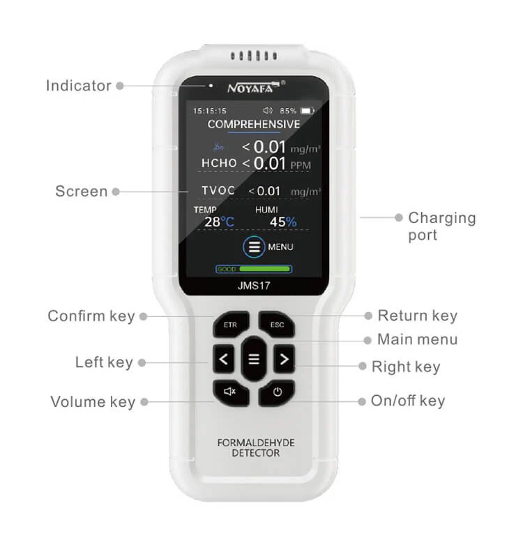 -Real-time measurement: HCHO (mg/m3 PPM), TVOC (mg/m3), temperature (°C) and humidity (%)