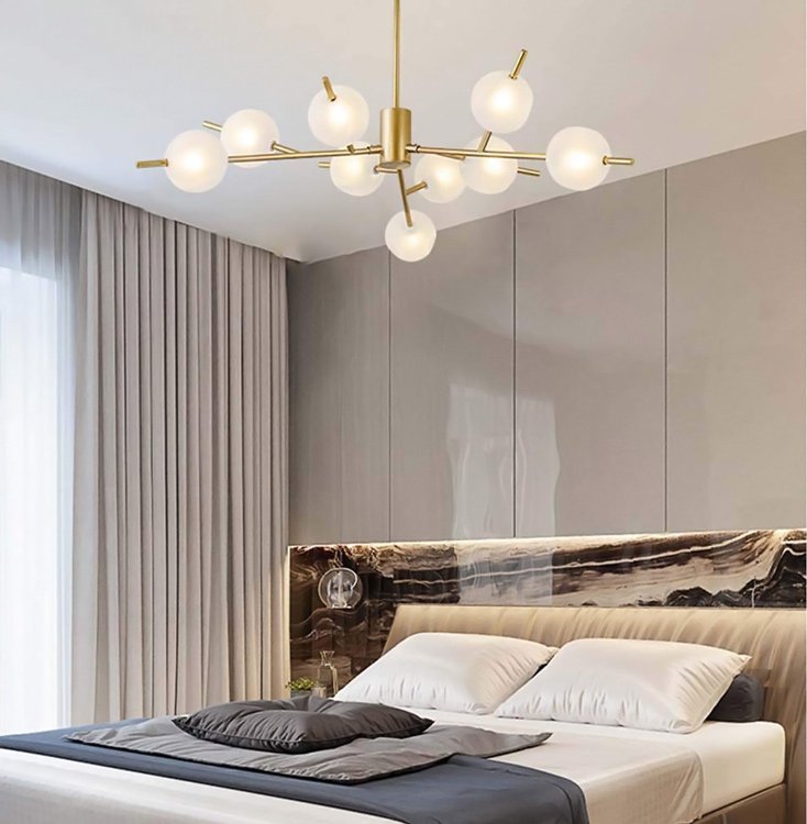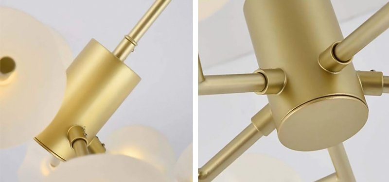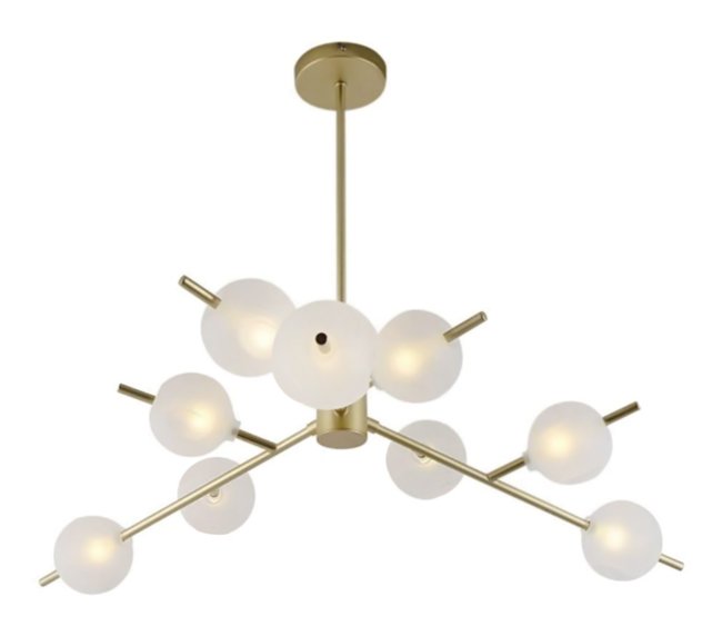Πολύφωτο φωτιστικό οροφής με μεταλλικό σώμα και 9 στρογγυλούς, γυάλινους γλόμπους, σε λευκό χρώμα. Διαθέτει συμπαγές σώμα στο οποίο στηρίζονται τρεις βραχίονες όπου κάθε ένας από αυτούς εξοπλίζεται με τρία ντουί. Οι γλόμποι είναι λευκοί, διαχέοντας το φως προς κάθε κατεύθυνση, ενώ προσφέρουν το πλεονέκτημα απόκρυψης της λάμπας.