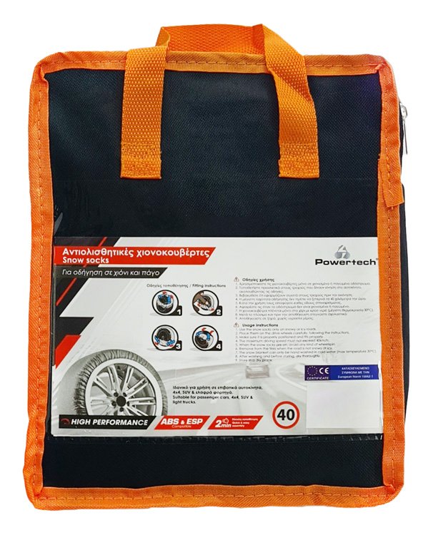 Αντιολισθητικές χιονοκουβέρτες της Powertech για ασφαλή οδήγηση σε επιφάνειες με χιόνι ή πάγο. Ο υφασμάτινος σχεδιασμός τους αποτρέπει τους κραδασμούς και αυξάνει την πρόσφυση των ελαστικών. Η τοποθέτηση τους γίνεται πολύ εύκολα, σε σύντομο χρονικό διάστημα και είναι συμβατές για χρήση με αυτοκίνητα που υποστηρίζουν συστήματα ESP και ABS.