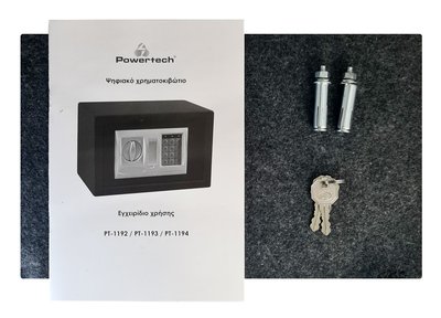 Χρηματοκιβώτιο της Powertech με δύο ενισχυμένους πύρους κλειδώματος, κατασκευασμένο από ατσάλι. Διαθέτει προγραμματιζόμενη ψηφιακή κλειδαριά, 3-8 ψηφίων, που σας επιτρέπει να επιλέγετε τον συνδυασμό που επιθυμείτε και κλειδαριά ασφαλείας με κλειδί που ανοίγει το χρηματοκιβώτιο σε περίπτωση ανάγκης.
