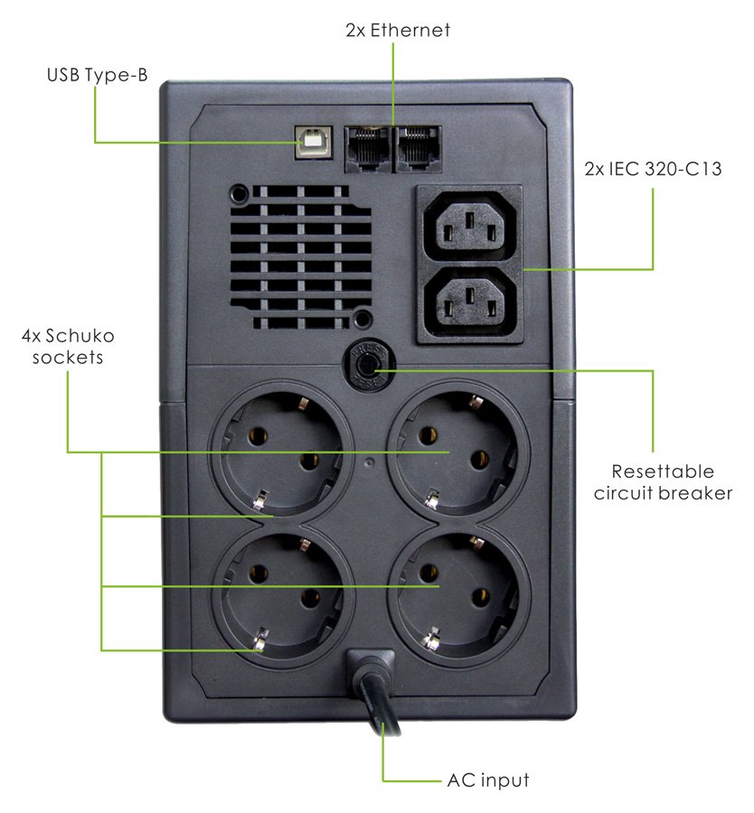 Output: 4x Schuko, 2x IEC-320 C13, 2x Rj45, 1x USB Type B