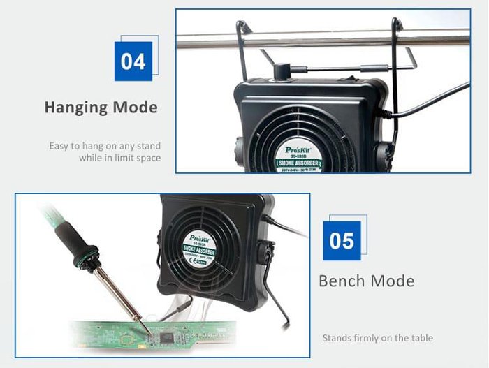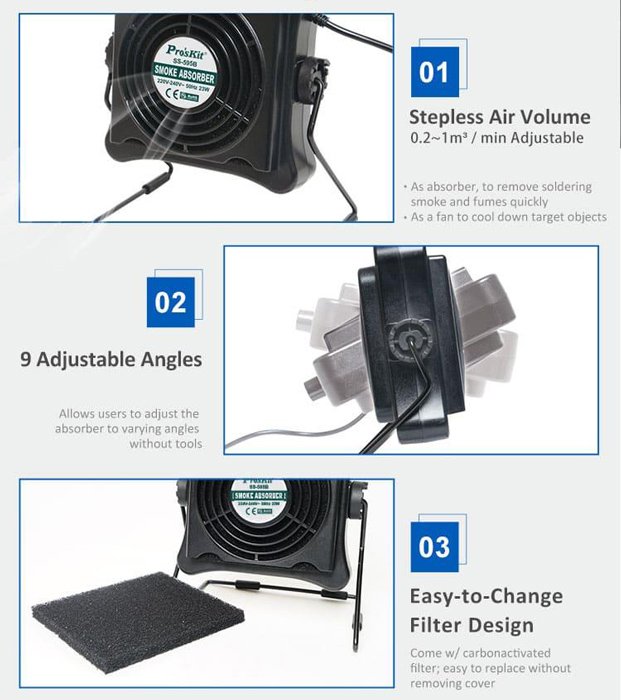 Ο σταθμός απορρόφησης καπνού της PROSKIT μπορεί να απορροφήσει αποτελεσματικά τις οσμές και βλαβερές ουσίες που παράγονται κατά την συγκόλληση επιτρέποντας σας να εργάζεστε σε ασφαλές περιβάλλον.