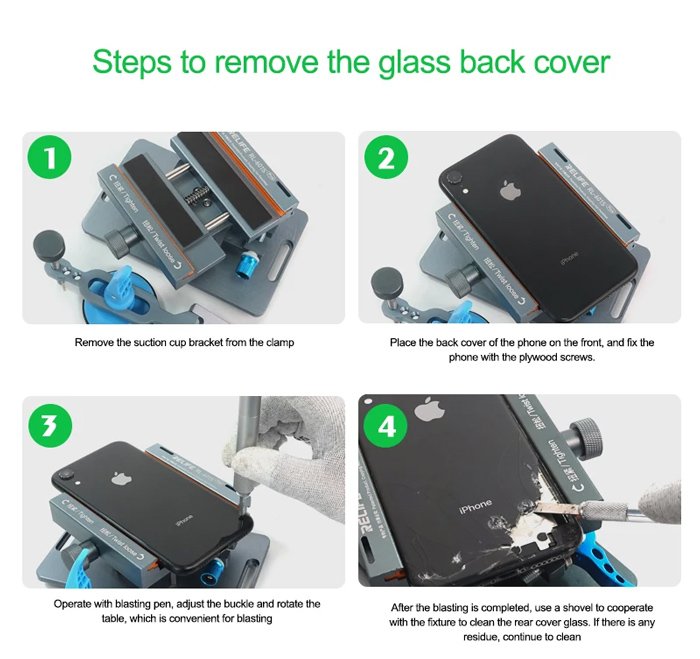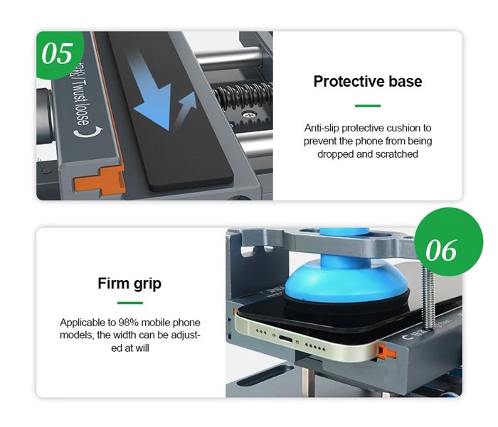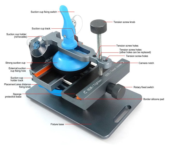 Ο διαχωρισμός της οθόνης γίνεται εύκολα με ισχυρή βεντούζα, χωρίς την χρήση θερμότητας. Η βάση τοποθέτησης του smartphone εξοπλίζεται με αντιολισθητικά pads που αποτρέπουν τις φθορές, ενώ διαθέτει και ειδική σχεδίαση για την προστασία της κάμερας. Το μήκος τοποθέτησης είναι ρυθμιζόμενο επιτρέποντας την τοποθέτηση smartphone διαφόρων μεγεθών.