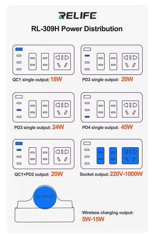 RELIFE σταθμός φόρτισης RL-309H, USB/3x USB-C/3x DC/wireless, 72W, λευκός