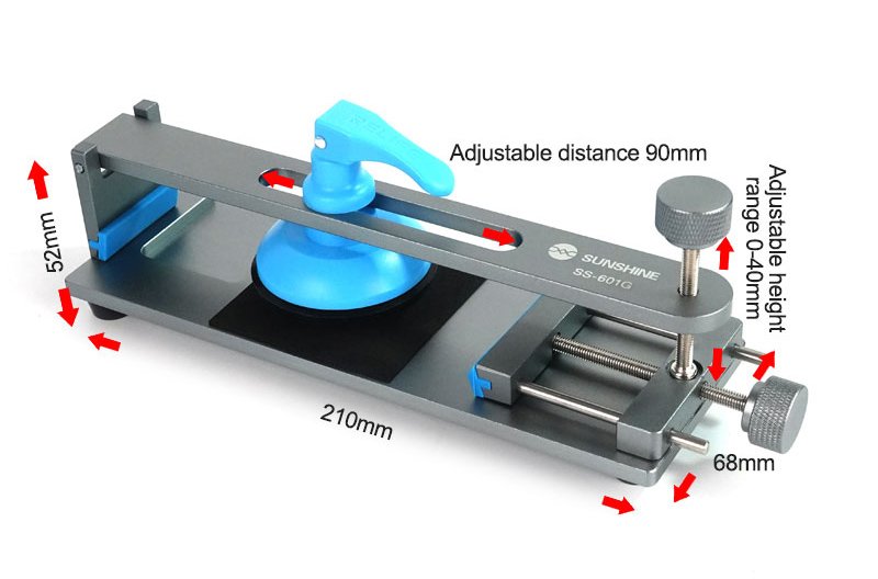 Εργαλείο διαχωρισμού LCD οθόνης smartphone από την Sunshine. Ο διαχωρισμός της οθόνης γίνεται εύκολα με ισχυρή βεντούζα, χωρίς την χρήση θερμότητας. Η βάση τοποθέτησης του smartphone εξοπλίζεται με αντιολισθητικό pad που δεν προκαλεί φθορές, ενώ διαθέτει και ειδική σχεδιάσει για την προστασία της κάμερας. Το μήκος τοποθέτησης είναι ρυθμιζόμενο επιτρέποντας την τοποθέτηση smartphone διαφόρων μεγεθών.