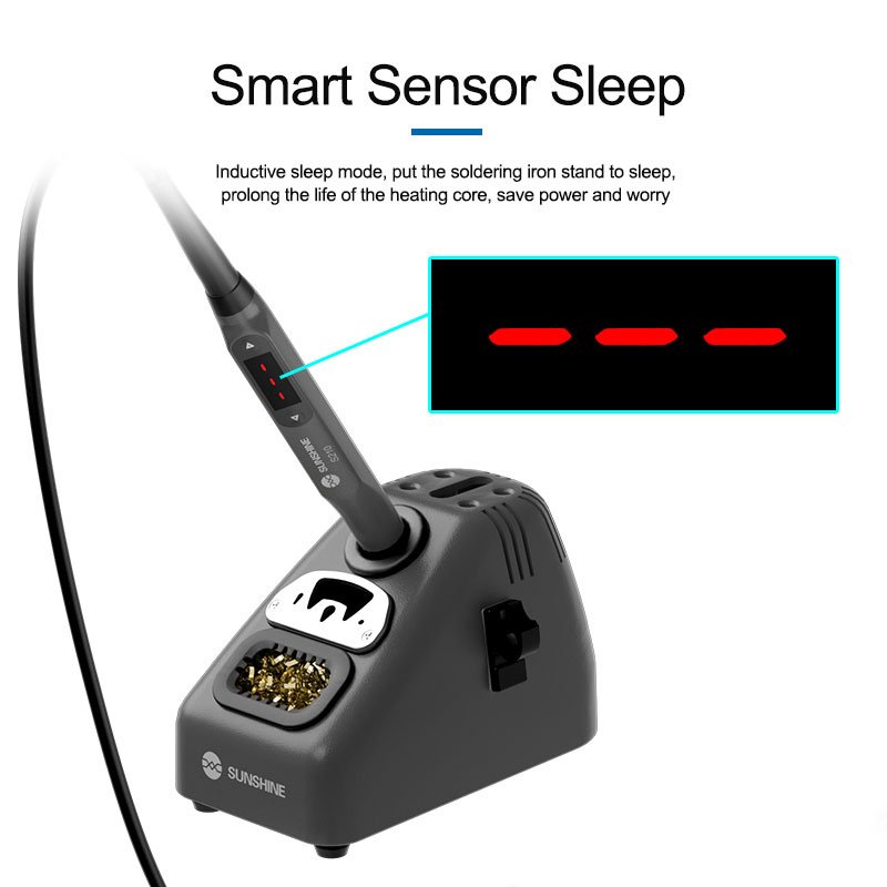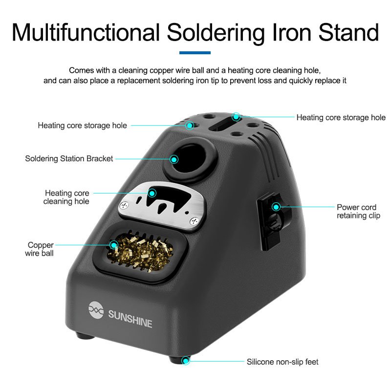 Σταθμός κόλλησης της Sunshine με υψηλή ισχύ 110W. Ενσωματώνει βάση για κολλητήρι και για σύρμα χαλκού, αλλά και αποθηκευτικό χώρο για τοποθέτηση των μυτών κολλητηρίου. Επιπλέον, διαθέτει εύκολο σύστημα αλλαγής μύτης, που επιτρέπει την αλλαγή της ακόμη και όταν η μύτη είναι ζεστή.