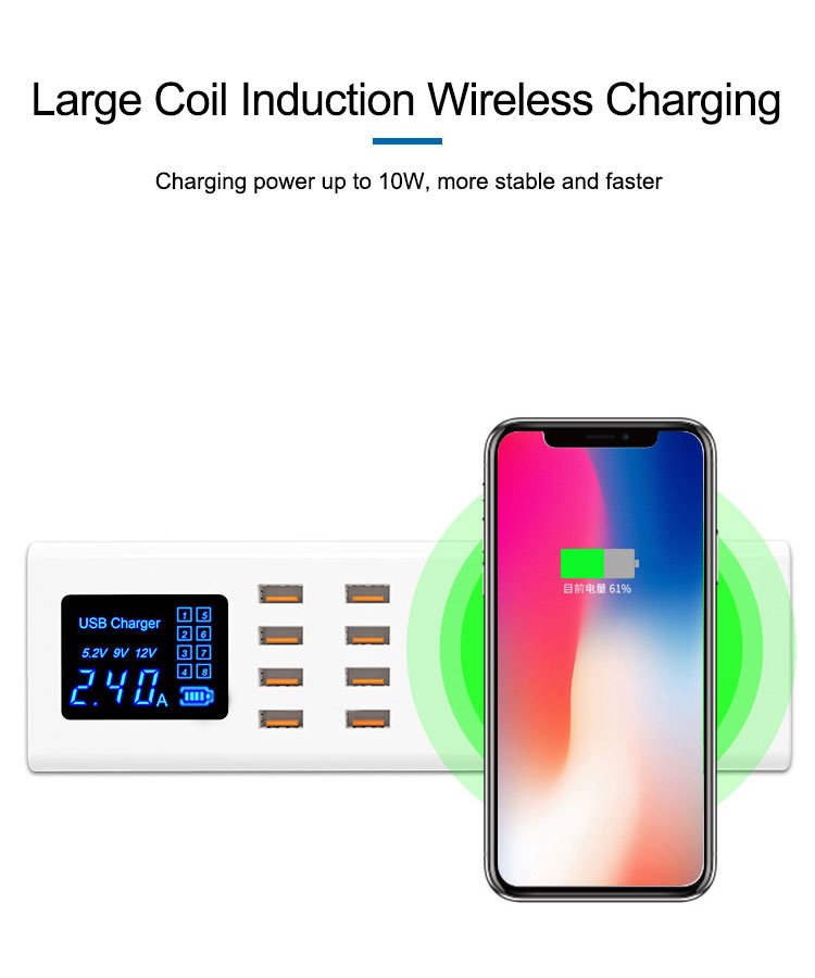 Σταθμός φόρτισης με 8x θύρες USB, για ταυτόχρονη φόρτιση έως 8 συσκευών, με μέγιστη απόδοση 8A. Διαθέτει οθόνη για την ένδειξη της απόδοσης φόρτισης και υποστηρίζει ασύρματη φόρτιση με απόδοση έως 10W.