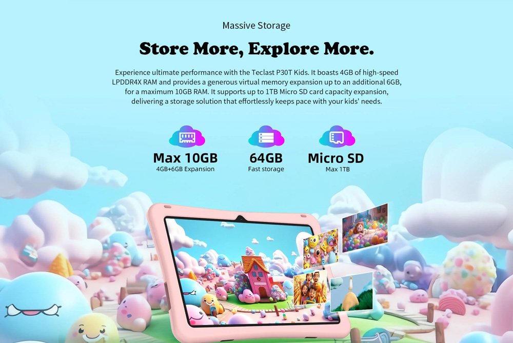 Με 4GB (+6GB virtual) RAM και 64GB ROM για να αποθηκεύετε τα αγαπημένα σας αρχεία, φωτογραφίες και βίντεο. Επιπλέον, προσφέρει την δυνατότητα να επεκτείνετε τον χώρο αποθήκευσης του tablet με κάρτα micro SD έως 1TB.