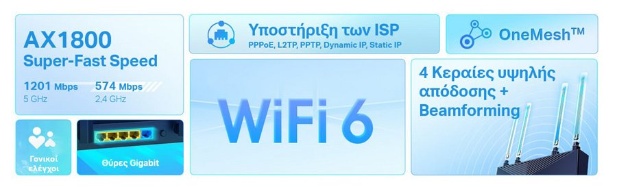 Το Archer AX23 χάρη στο τελευταίας γενιάς WiFi 6, προσφέρει γρηγορότερες ταχύτητες, λιγότερη καθυστέρηση και υψηλότερη χωρητικότητα, επιτρέποντας ταυτόχρονες συνδέσεις στο οικιακό σας δίκτυο. Ολοκληρώστε απλές εργασίες, όπως αποστολή e-mail ή περιήγηση στο internet στη ζώνη 2.4 GHz με ταχύτητες έως 574 Mbps και πιο απαιτητικές εργασίες, όπως διαδικτυακά παιχνίδια ή παρακολούθηση ταινιών στη ζώνη 5 GHz με ταχύτητες έως 1201 Mbps, ταυτόχρονα και χωρίς καθυστέρηση.