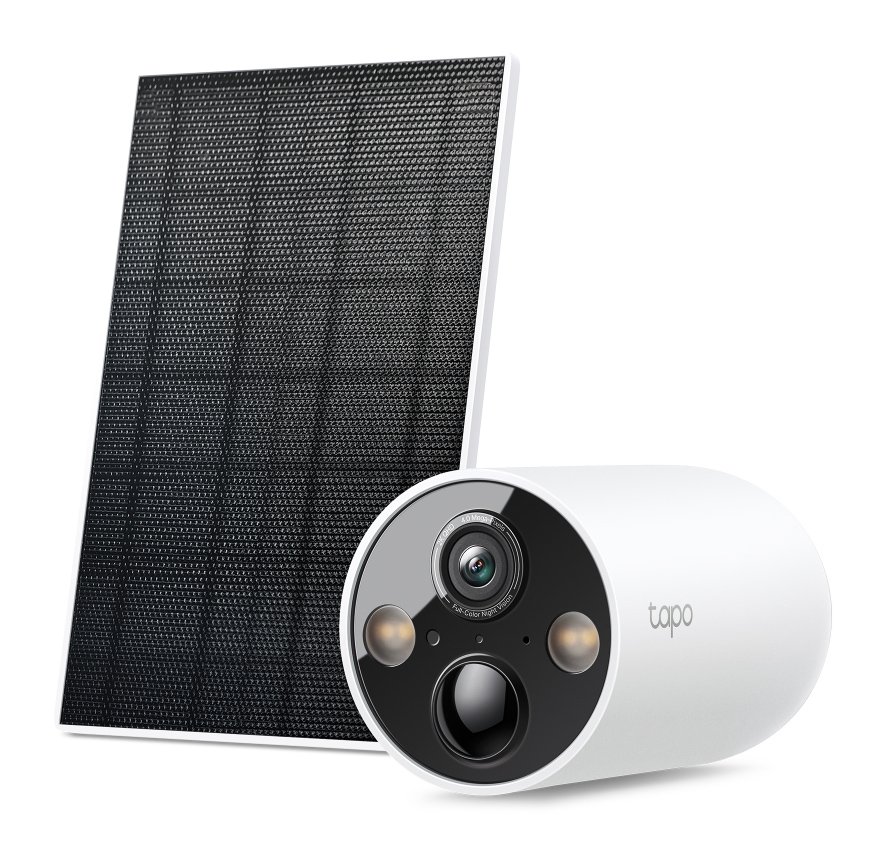 Smart ηλιακή κάμερα εξωτερικού χώρου της TP-Link με εικόνα ανάλυσης 2K και ενσωματωμένο μικρόφωνο και ηχείο που επιτρέπει την αμφίδρομη μεταφορά φωνής και ήχου.