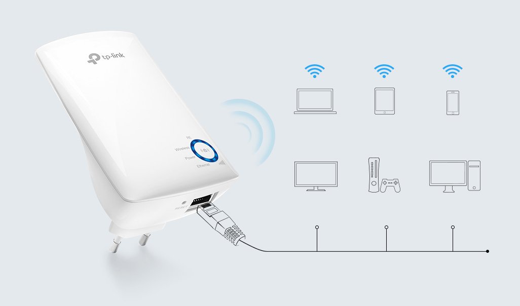 Εκτός αυτού, το TL-WA850RE μπορεί επίσης να χρησιμοποιηθεί ως ένας προσαρμογέας ασύρματου δικτύου για να βοηθήσει μια ενσύρματη συσκευή, όπως μια κονσόλα παιχνιδιών ή τηλεόραση για να λάβει Wi-Fi σήμα.