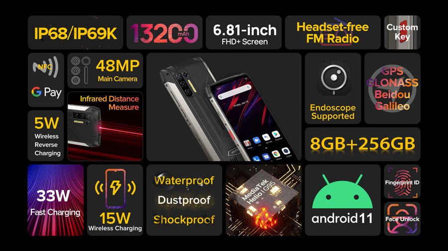 ULEFONE smartphone Power Armor 13, 6.81″, 8/256GB, 13200mAh, IP68/IP69K, μαύρο