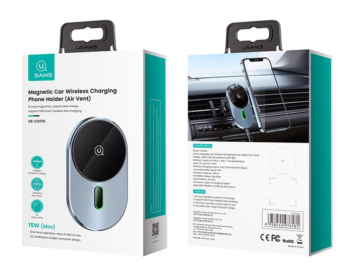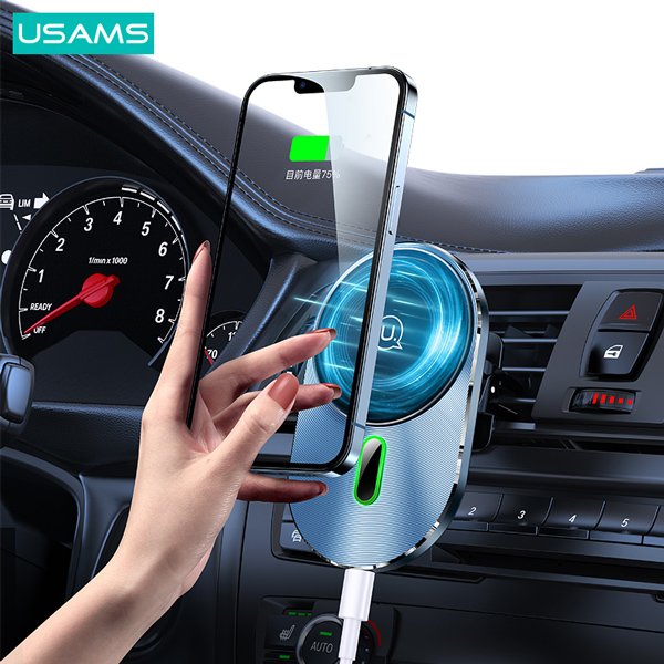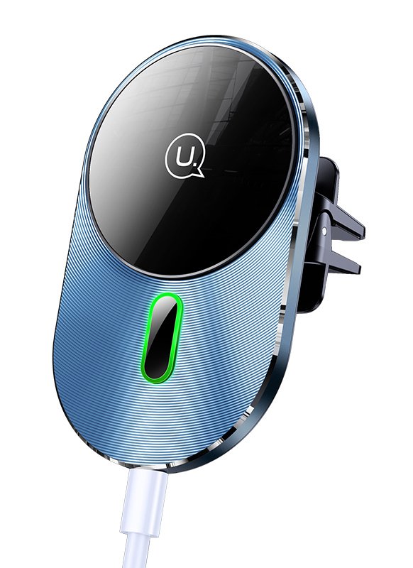 Ασύρματος φορτιστής και βάση με στήριξη στους αεραγωγούς του αυτοκινήτου της Usams. Η ισχυρή μαγνητική δύναμη κρατάει το smartphone σταθερό και ασφαλές ενώ παράλληλα το φορτίζει ασύρματα με απόδοση έως 15W.