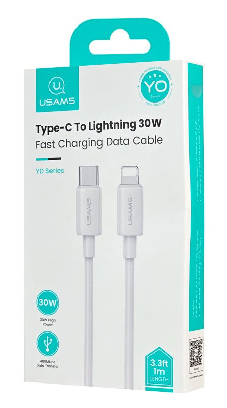 Καλώδιο φόρτισης και μεταφοράς δεδομένων Lightning σε USB-C της Usams. Υποστηρίζει φόρτιση με απόδοση έως 30W και μεταφορά δεδομένων με ταχύτητα έως 480Mbps.