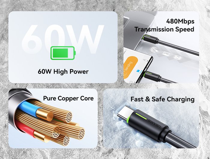 Καλώδιο φόρτισης και μεταφοράς δεδομένων USB-C σε USB-C της Usams. Υποστηρίζει φόρτιση με απόδοση έως 60W και μεταφορά δεδομένων με ταχύτητα έως 480Mbps.