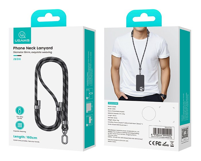 USAMS κορδόνι λαιμού για κινητά ZB316, 160cm, universal, μαύρο
