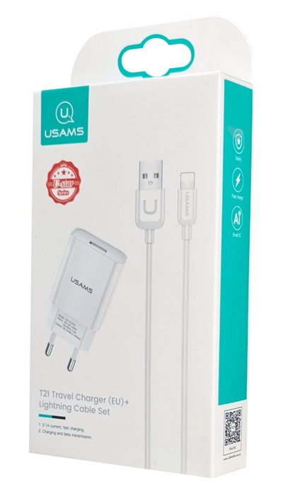 USAMS φορτιστής τοίχου T21OCLN01 με καλώδιο Lightning, USB 2.1A, λευκός