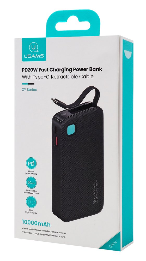 USAMS power bank CD224 με καλώδιο USB-C, 2x θύρες εξόδου, 10000mAh, 20W, μαύρο