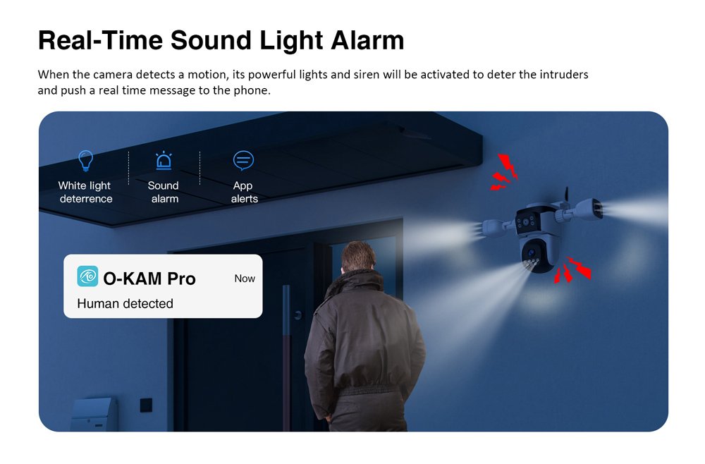 Μπορεί να ανιχνεύσει την ανθρώπινη σιλουέτα και κίνηση, στέλνοντας ειδοποιήσεις στο smartphone σας κάθε φορά που ανιχνεύεται κίνηση αλλά και να ενεργοποιήσει ηχητικό και οπτικό (με φως) συναγερμό.